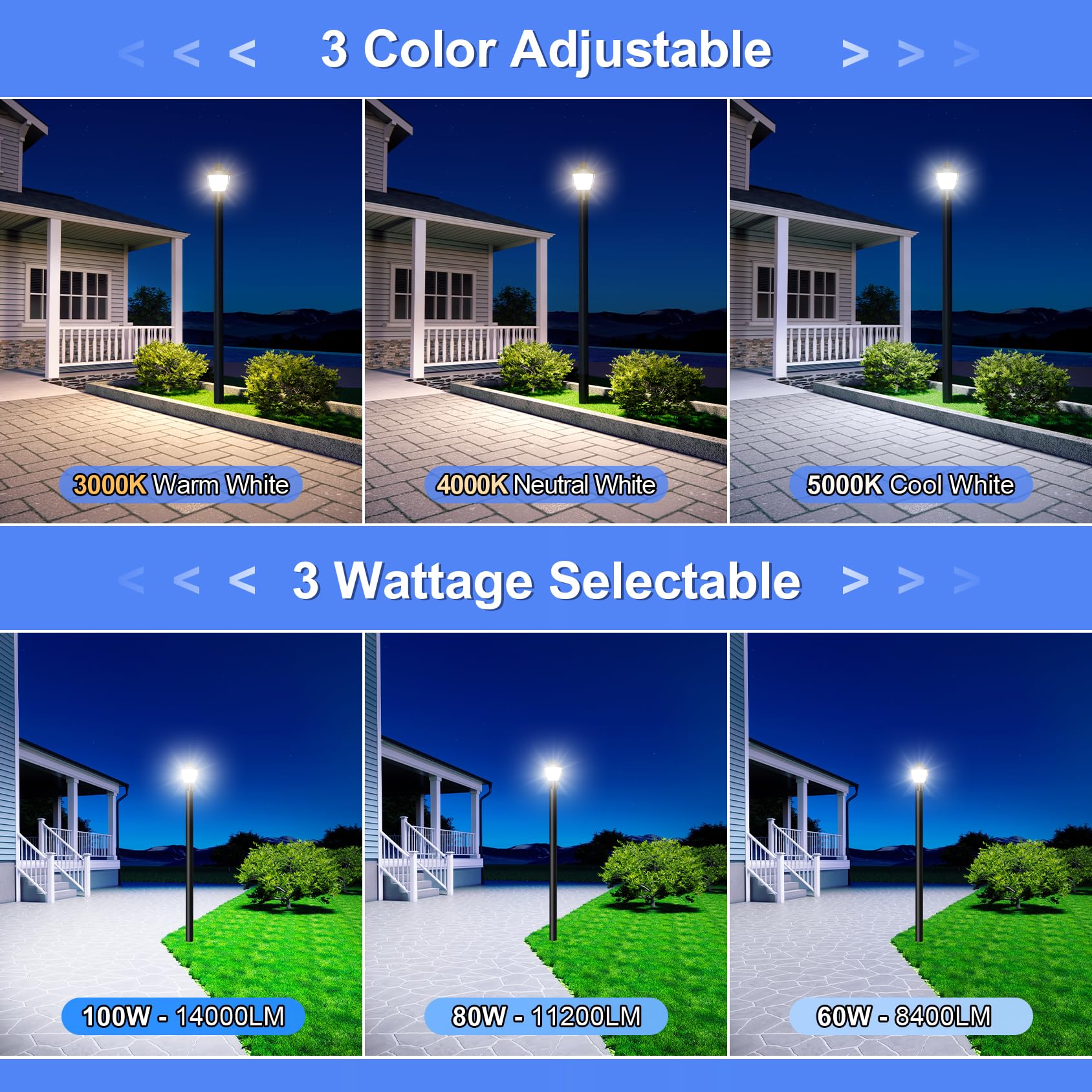 KUKUPPO 100W/80W/60W LED Post Top Light - ETL&DLC,15000LM,3000K/4000K/5000K,AC100-277V,IP65,With Built-In Photocell