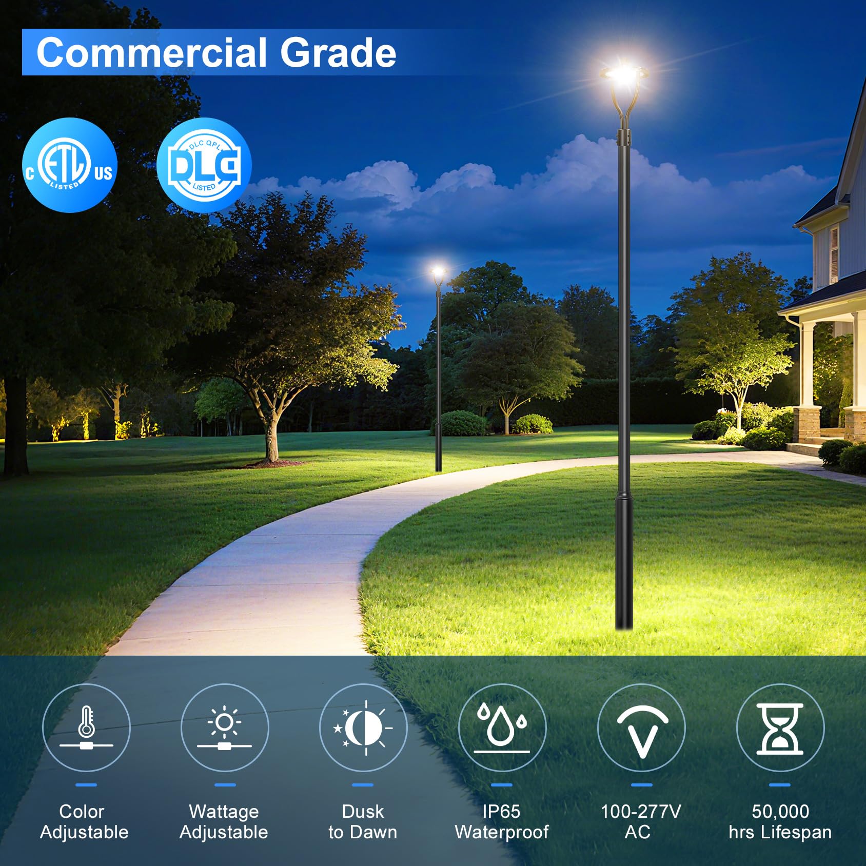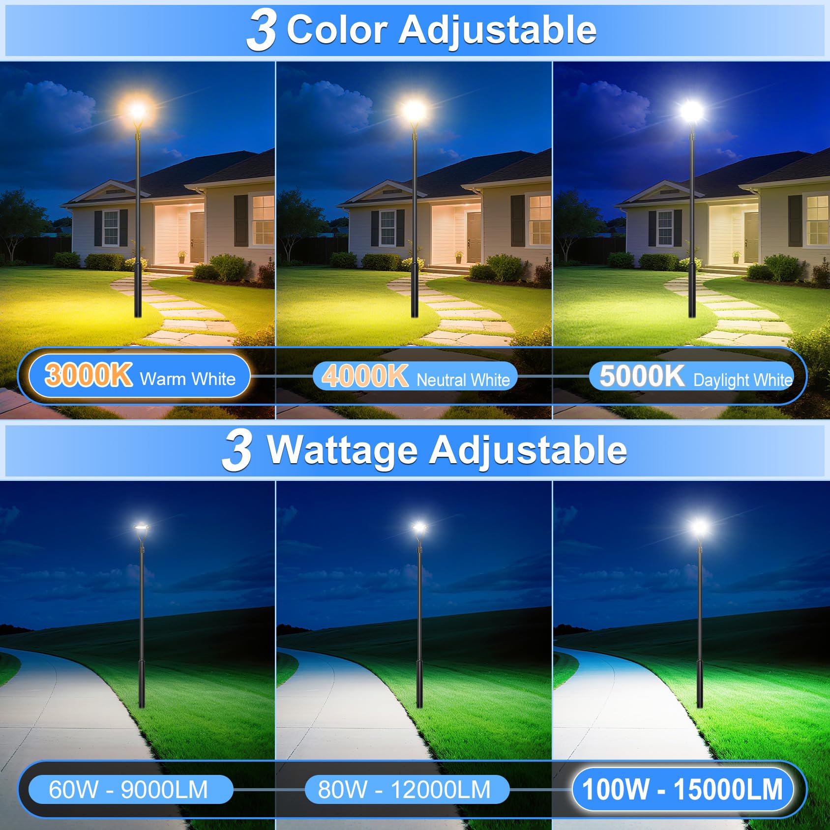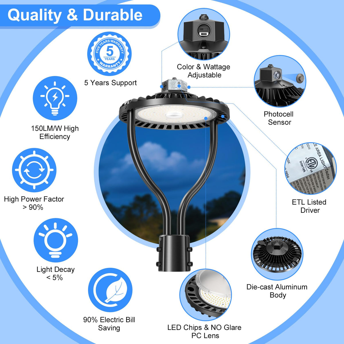 KUKUPPO 100W/80W/60W LED Post Top Light - ETL&DLC,15000LM,3000K/4000K/5000K,100-277VAC,IP65,With Photocell