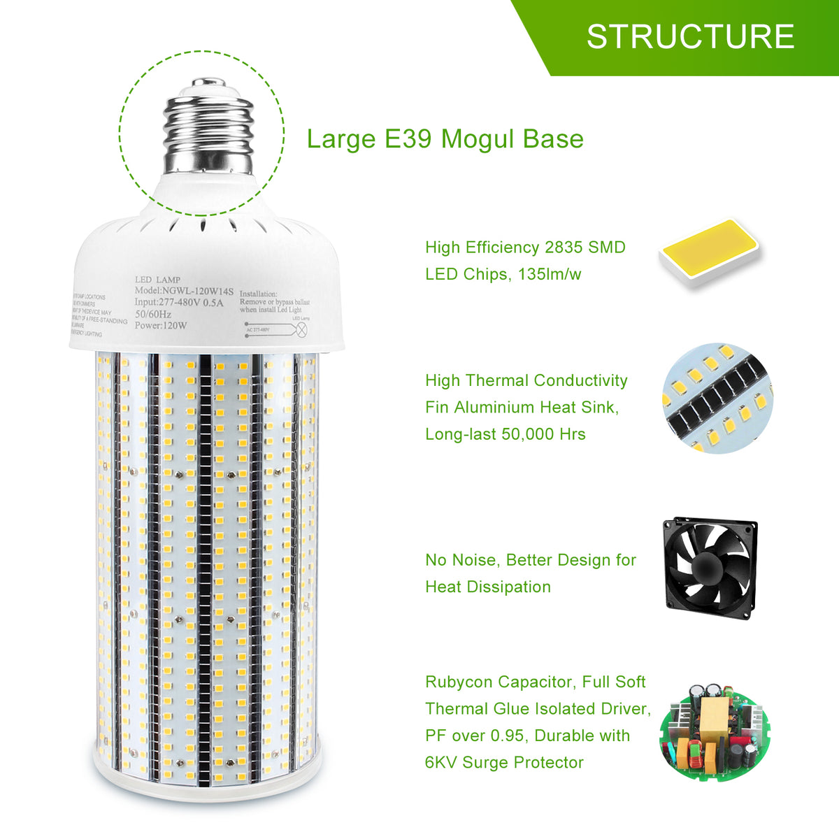 KUKUPPO 120W New LED Corn Light - ETL&UL&CE,16800LM,5000K,277-480VAC,E39,PC Cover
