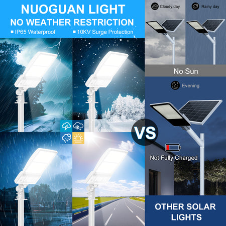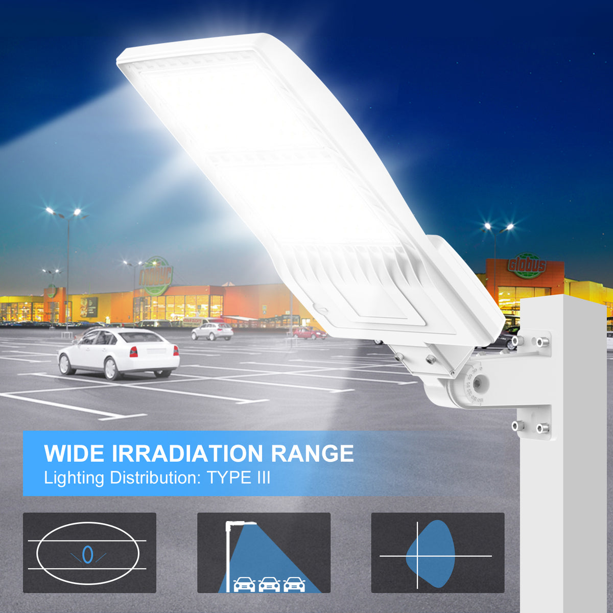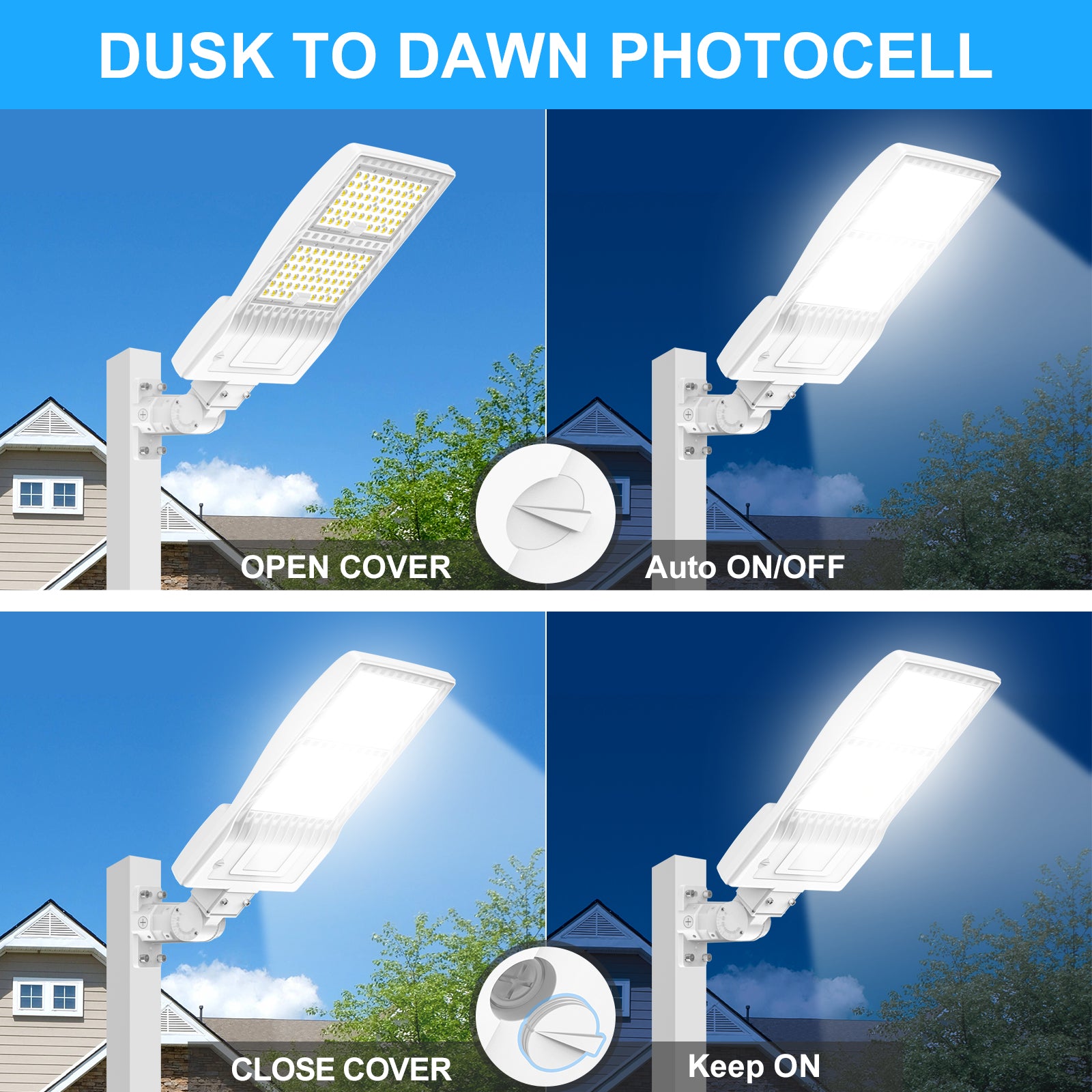 Light turns on at dusk, off in the morning. 5000K is clean white, not yellow.